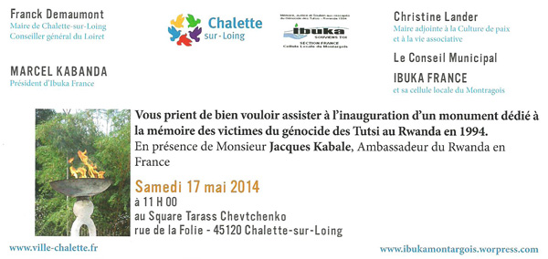 L’inauguration d’un monument dédié à la mémoire des victimes du génocide des Tutsi du Rwanda aura lieu le samedi 17 mai 2014 à 11 h, au Square Tarass Chevtchenko, rue de la Folie à Chalette.