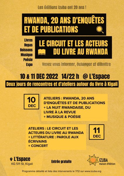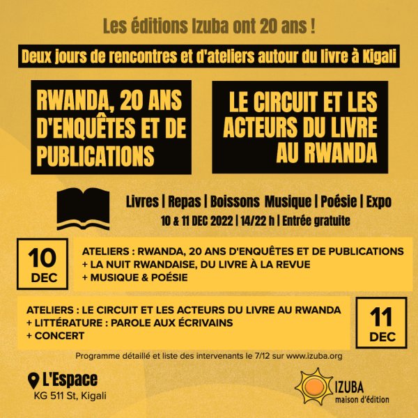 Il y a deux décennies, Jean-Paul Gouteux publiait son livre somme, La nuit rwandaise, et fondait les éditions Izuba. À l’occasion du vingtième anniversaire de ces deux évènements, l’équipe des éditions Izuba organise à Kigali deux jours de rencontres, ateliers, débats et spectacles pour mettre en valeur et célébrer la création littéraire au Rwanda et rassembler acteurs et amis du livre : écrivains, lecteurs, illustrateurs, imprimeurs, photographes, éditeurs, bibliothécaires, etc.